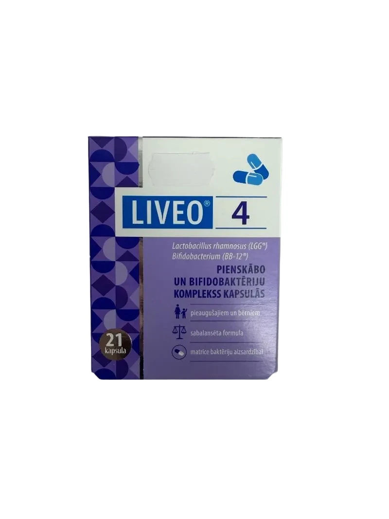 Katra LIVEO 4 kapsula satur vismaz 4 miljardus (4 x 109) pienskābo baktēriju Lactobacillus rhamnosus (LGG®) un bifidobaktēriju Bifidobacterium (BB-12®) kolonijas veidojošās vienības (KVV). Pienskābās un bifidobaktērijas ir zarnu trakta dabiskie iemītnieki – daļa no zarnu mikrofloras.