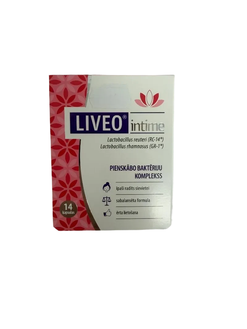 LIVEO INTIME kapsulas (14 gab.) – pienskābo baktēriju celmus Lactobacillus reuteri (RC-14®) un Lactobacillus rhamnosus (GR-1®) saturošs komplekss kapsulās sievietēm. Katra LIVEO intime kapsula satur vismaz 2 miljardus kolonijas veidojošās vienības (KVV) Lactobacillus reuteri RC-14® un Lactobacillus rhamnosus GR-1®.